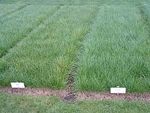 Barenbrug grass seed on the right shows resistance to the growing problem of dreschlera leaf spot while the variety on the left has fallen prey to the disease.