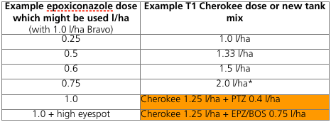 - Higher Septoria tritici risk with low to moderate eyespot – new tank mix of 1.25 l/ha Cherokee + 0.4 l/ha prothioconazole