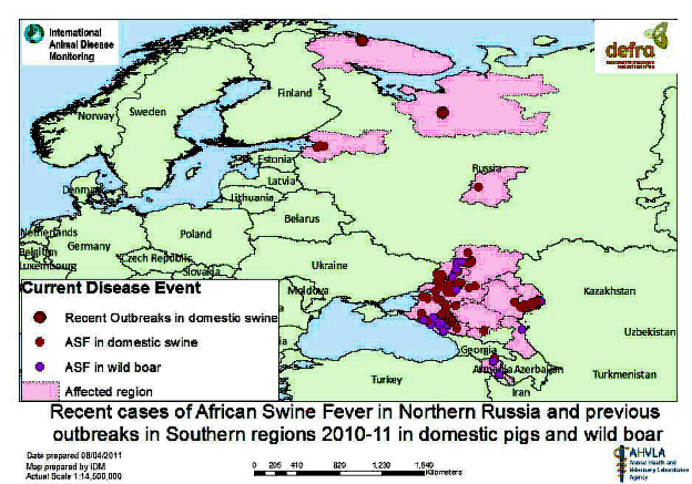 • There has been a continuing problem with ASF in Russia since September of 2009 (see map below). The most recent outbreaks reported in late March and early April have indicated large jumps in the disease which raises concerns that there is an increased risk of infected pig meat or pig products circulating widely in the region which is being fed to pigs via swill (swill feeding is outlawed in the UK).