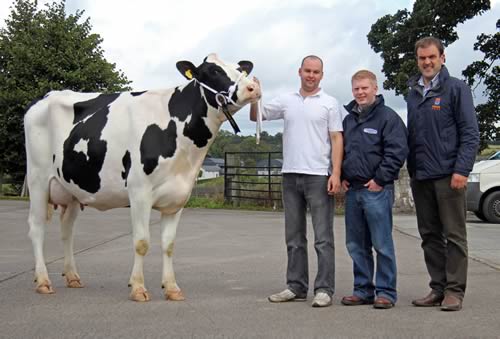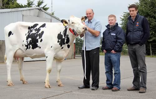 Born in March 2011, and sired by the Regancrest Mr Samuelo son, Newry Dotman, she is out of the 2011 Castlewellan Show interbreed champion, Newry Goldwyn Mayflower EX93-2E, which gave over 13,700kgs at 4.51% butterfat and 3.12% protein in her third 305-day lactation. Calved four weeks and yielding 36kgs daily, she was snapped up by Robert McKnight, Templepatrick, County Antrim.
