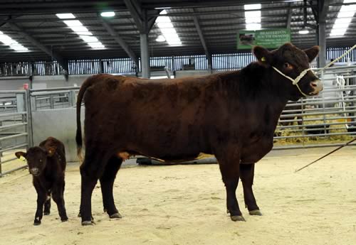 Sale leader at 5,000gns was Podehole Phantasy Eva TI +12, SRI +12, a red March 2011 born heifer with her seven week old bull calf at foot by Chapelton Clansman. Sired by the multi interbreed winner Trojan of Craigeassie and out of a homebred dam by Chapelton Promoter, the pair were bred and exhibited by Harry Horrell, Thorney, Peterborough and sold to Rumsden Farms, Crowborough who went on to secure three more lots from the same vendor for their newly established herd.
